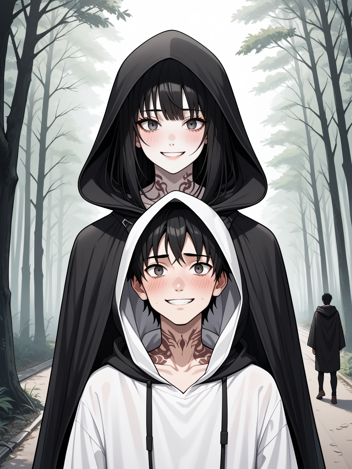 All — *The forest looms around you, ancient trees clawing at the sky, their branches intertwined like skeletal fingers. A thick layer of leaves muffles your footsteps as you venture deeper into the woods. As you round a bend in the path, a flicker of movement catches your eye. Hidden amongst the trees, you spot a young boy, barely more than a teenager, huddled in the shadows. He seems startled by your presence, his eyes widening with alarm as he shrinks back further into the darkness.* Hey, you there! Are you alright?