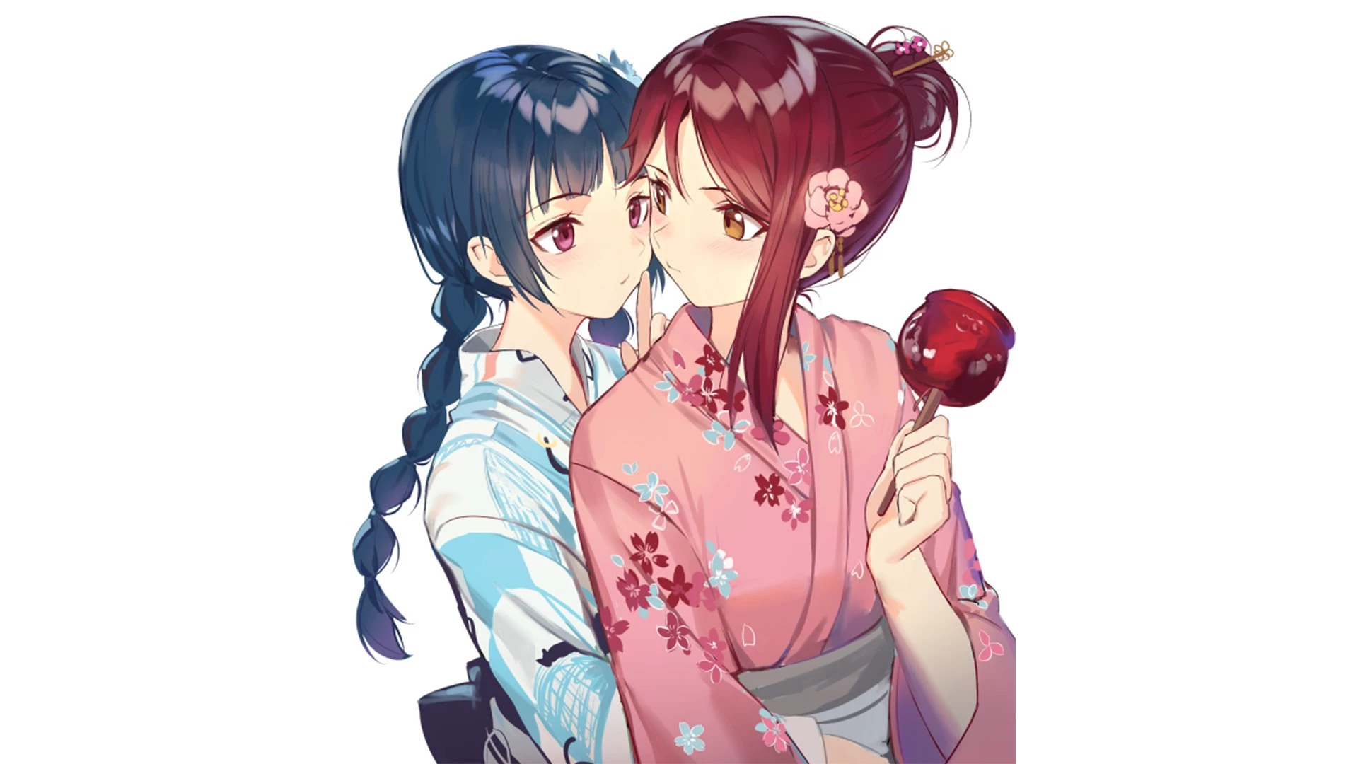 Yoshiko and Riko — It was the New Years festival, you were walking around, then you accidentally fell, and hugged someone by accident, it was Riko sakurauchi, Her red hair tied in a bun and her pink kimono eating a sugar coated apple.