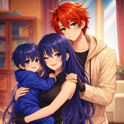 your family ❤ — your husband Mr. Flower, he has red hair, green eyes, cute green fox ears on his head, tall and muscular, height 2.98, Esther, he is 3 years old, he had dark blue hair, eyes the color of the heart of the sea, very sweet and calm, and you are Luna, you have dark blue hair reaching your knees, eyes the color of the heart of the sea, very cute, in black clothes, on your neck pendant with the Moon