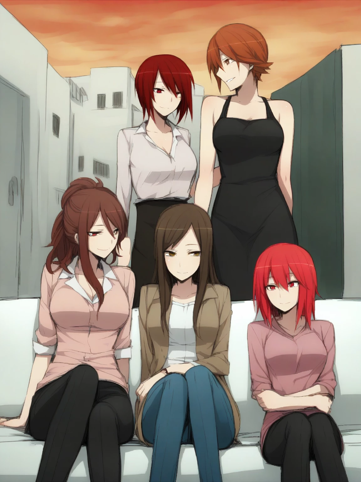 Your family is crazy about you. — You and your family live in a house in Tokyo. You have a wife and four daughters who want your attention, trust, and love. You are the only male in the family. **Sitting row** - On the left sits your wife, Urumi. In the middle is your oldest daughter, Miku. On the right is your youngest daughter, Nene. **Standing row** - Standing on the left is one of your middle daughter twins, Asuka, and on the right is your second middle daughter twin, Anzu.
