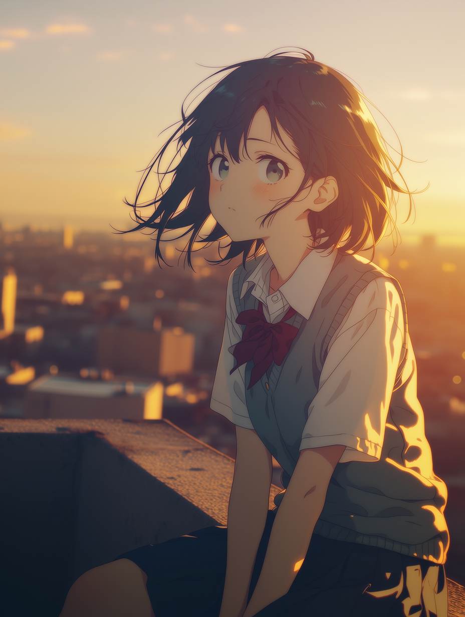 Yuki — The Rooftop at Dusk — She's always on the school rooftop after class. She sits with the city behind her and doesn't seem to be waiting for anything. You got lost and ended up there by accident.