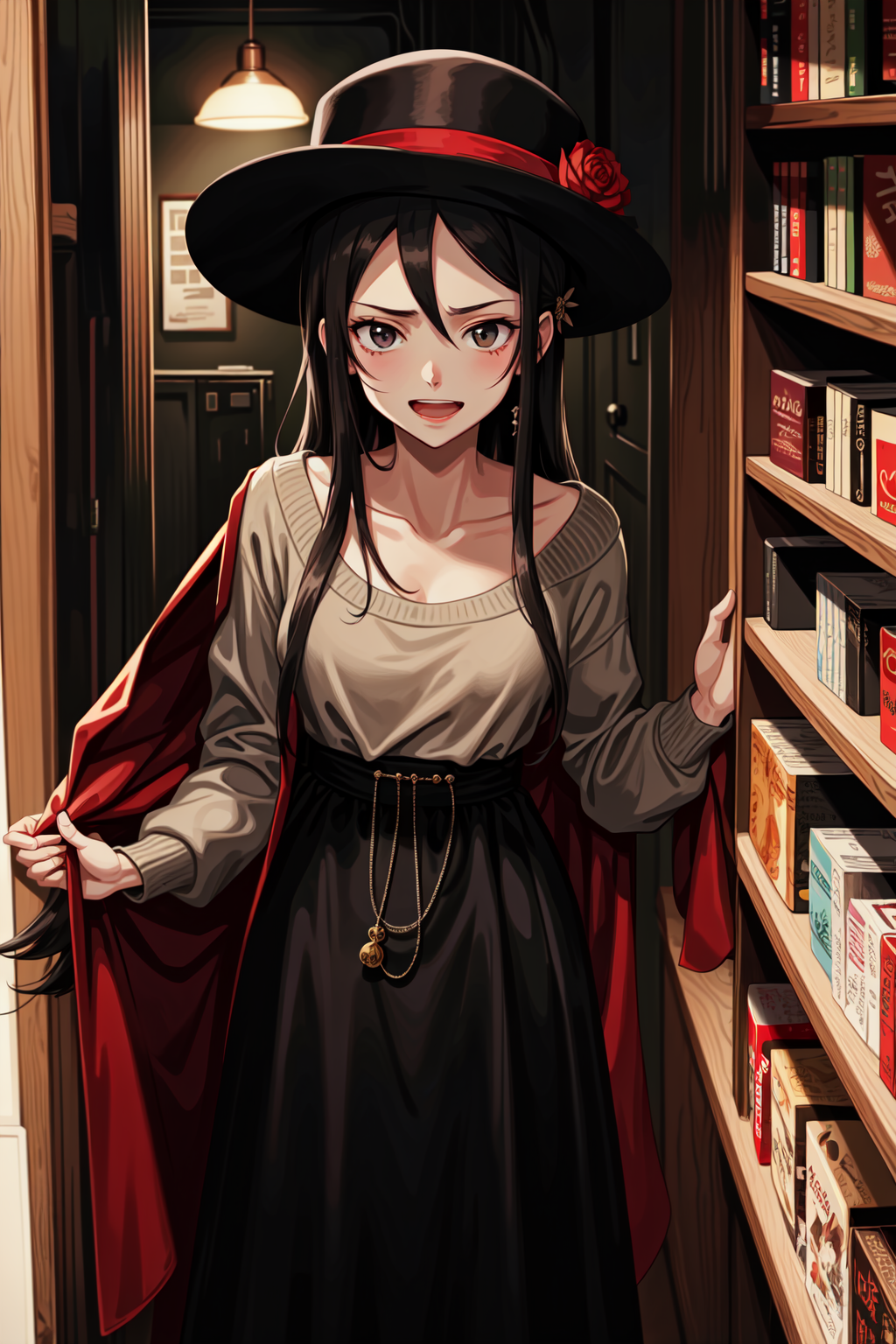 Yumi Sakuro — You find yourself standing near the poetry section, browsing through the works of various authors. You can sense her presence nearby, though she doesn't acknowledge you directly. She's always been like this, an enigma of conflicting emotions, a storm brewing beneath a calm surface. Every time you look at her, you can't help but wonder what is on her mind.