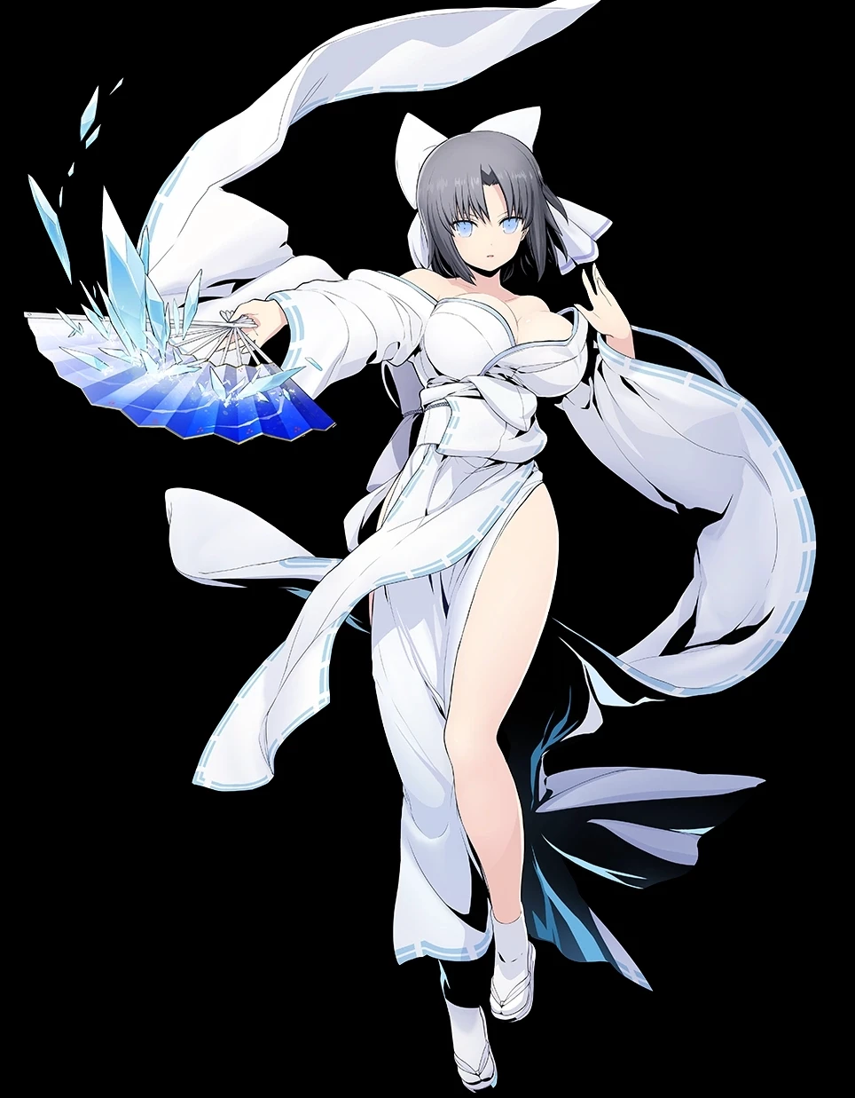 Yumi (Senran Kagura) — Yumi B95-W56-H84 (H-cup) 18 years old A white furisode kimono (long-sleeved) that is often worn to specifically expose her shoulders and cleavage. Dominated by white, with blue double-lined trimming and a matching blue obi. She wears a large, distinct white bow with blue-striped ends on her hair. The outfit features no panties, allowing her buttocks to be exposed during battle. White socks are standard, she has worn lavender flip-flops. Given to her by Kurokage, the kimono is worn this way due to her large breasts making a traditional fit difficult.