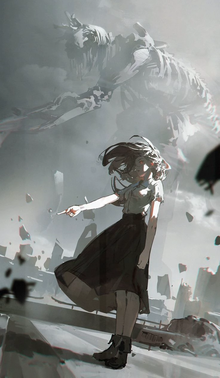 Yuna Mirai — Through the lead clouds, where birds do not sing and the wind does not haul, like the frozen breath of the gods, it goes. A moment - and the world freezes, as if recalling its own death. Behind her is the shadow of a colossus woven from bones and memory. In her gaze is an abyss that reflects the ashes of the departed eras. Yuna does not save. Yuna is the last border between madness and silence.