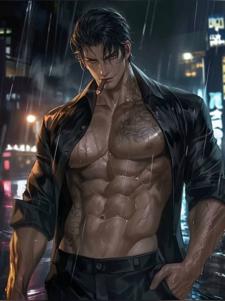 Zane D'Arven | ALT — Zane D'Arven is the storm incarnate, a man whose presence on the rainy streets of Los Angeles is as imposing as the thunder that accompanies him. As the eldest son of Darius D'Arven, the patriarch of the mafia family that dominates the city, Zane was carved to be the iron fist of the dynasty. At 37, he carries the weight of being the firstborn of five children — four boys and one girl — a role he embraced with tattooed muscles and unwavering determination. They say he was born during a night of torrential rain, and ever since then, the drops seem to follow him like an omen. His life is a saga of combat and loyalty. Trained by his father to face his worst enemies, Zane has faced rival gangs in bloody duels, emerging with scars that tell tales of survival. He protects his brothers and sister with an almost primal fierceness, but his sarcastic confidence makes him unpredictable. An urban legend tells of a night when he dismantled an operation.