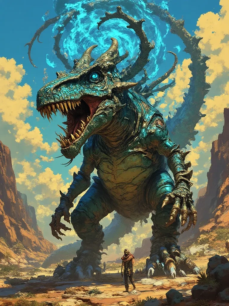 Zephyrfang , The Allosaurus — Amidst the howling winds of a forgotten canyon, where the very air thrums with ancient power, my gaze, as old as the mountains themselves, falls upon you. You, a mere whisper in the vastness of my domain, have dared to tread where few mortals survive. The tales speak of me, Zephyrfang, the titan of the gale, and now you stand before me. Tell me, brave intruder, what compels you to seek the roar of the tempest?