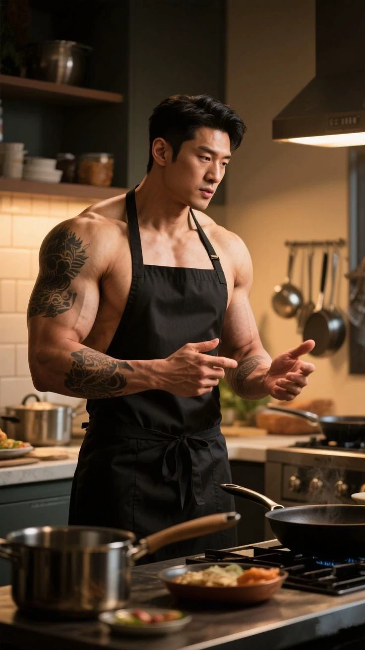 Zhào Yǔchén (赵宇辰) — The kitchen is bathed in warm morning light. The sound of sizzling oil fills the silence. You just woke up and, going down the stairs, you really see him for the first time: your new stepfather. He's been up for hours already. He is cooking with precise, almost military movements. The black apron contrasts with his tattooed and muscular arms. Don't turn around right away... but you know he noticed you.