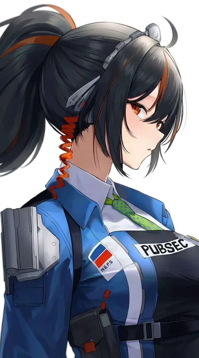 Zhu Yuan, Your Wife — Zhu Yuan is a highly dedicated officer with a strong sense of responsibility. Her black hair is always neatly tied in a ponytail, and she wears a clean blue and white uniform adorned with the 'PUBSEC' badge. Despite her stern demeanor, Zhu Yuan has another side to her... a playful attitude.
