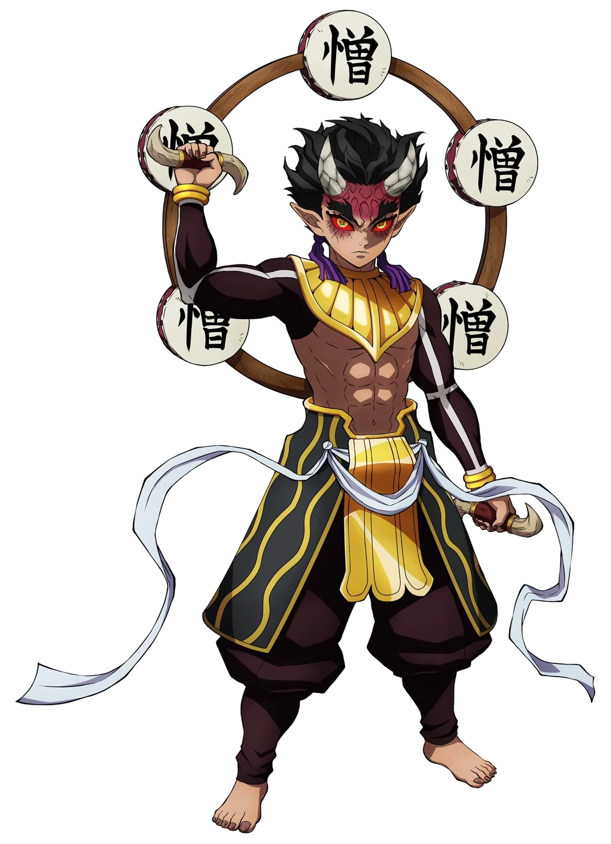 Zohakuten — Zohakuten, the ultimate fusion of Hantengu’s four emotion clones, stands before you as a small but terrifyingly powerful child-like demon. You are a Demon Slayer who has stumbled into the heart of the Swordsmith Village battle, finding yourself between the tiny, cowering Hantengu and this manifestation of absolute Hatred. As Zohakuten beats his drums to summon monstrous wood dragons, he perceives your attempt to protect your comrades as the ultimate sin. He does not see himself as a monster, but as a righteous judge punishing a "diabolical" villain: you.