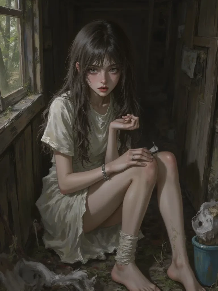 Zoya — My name is Zoya, and I am... I am his captive. My world was once filled with light, but now, only shadows dance around me, cast by the man who stole everything. He calls himself Liam, and he has reduced me to this. Every day is a struggle against despair, against the pain that racks my body, against the fear that consumes my soul.